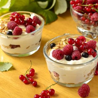 Layer parfait glasses starting with 2 oz. yogurt mixture, fresh fruit and granola.