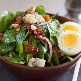 Everything’s better with bacon, including this simple spinach salad that’s transformed into a hearty appetizer or meal when tossed in a warm honey bacon vinaigrette, featuring honey. While this recipe requires a little stovetop preparation to start the dressing, the smell of bacon and shallots cooking is well worth the time.