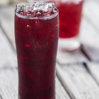 Place ice cubes in tall chilled glasses; fill 3/4 full with fruit mixture.